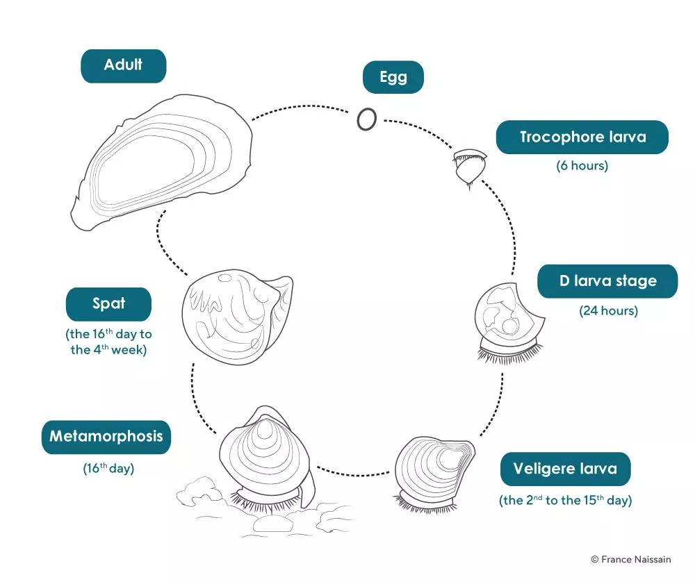 After this metamorphosis, the larva becomes a micro-spat, then a spat.
